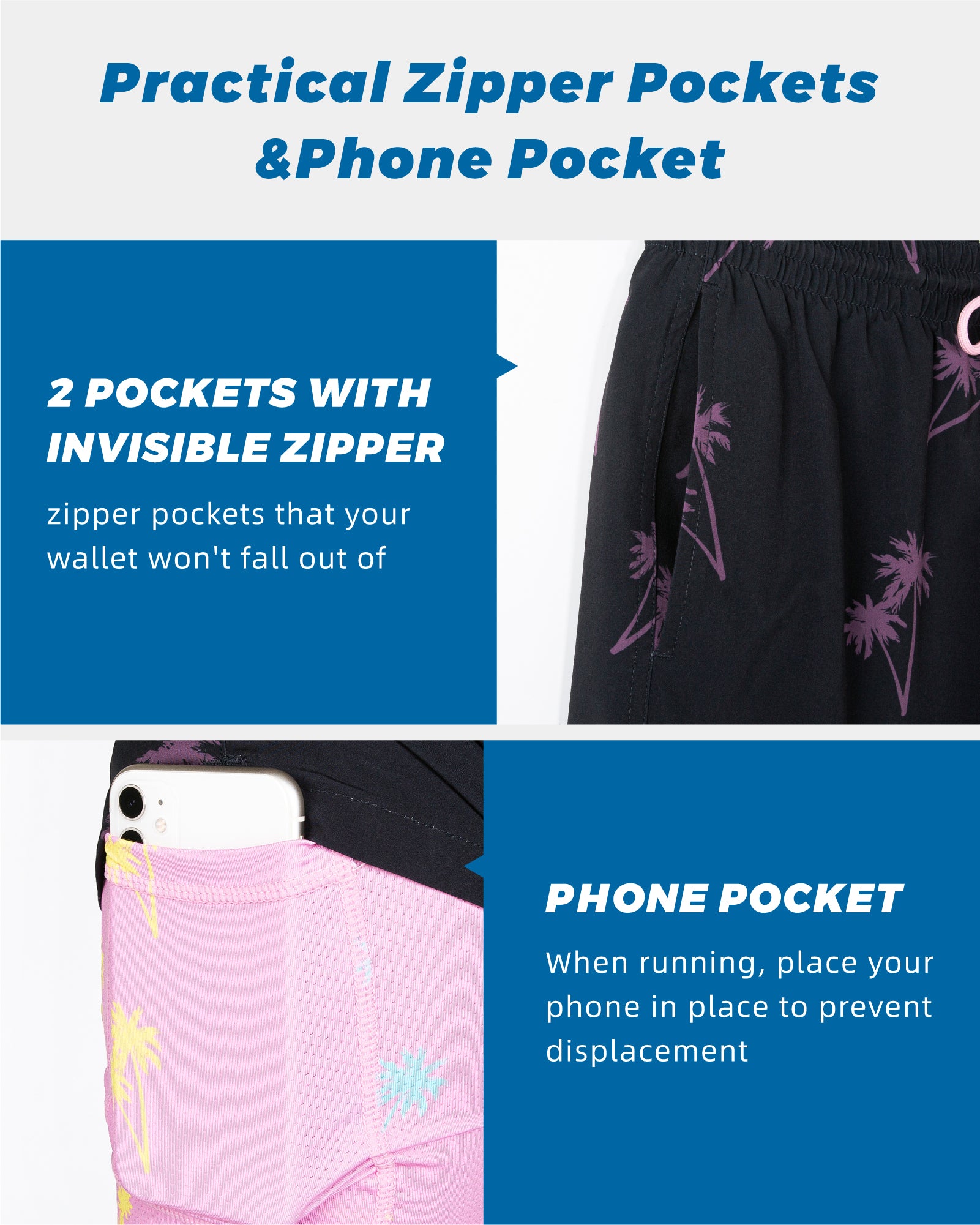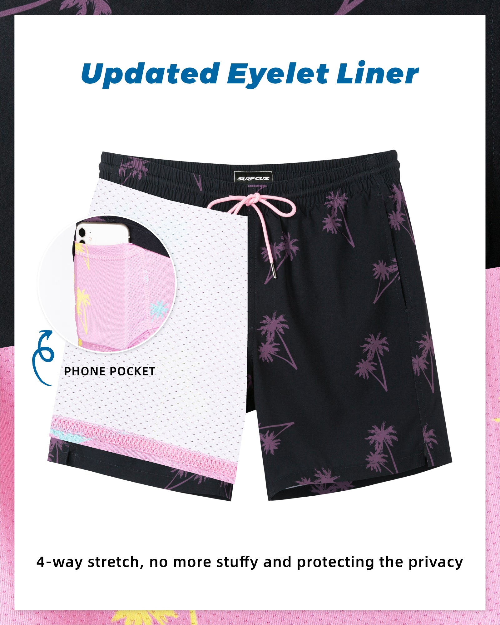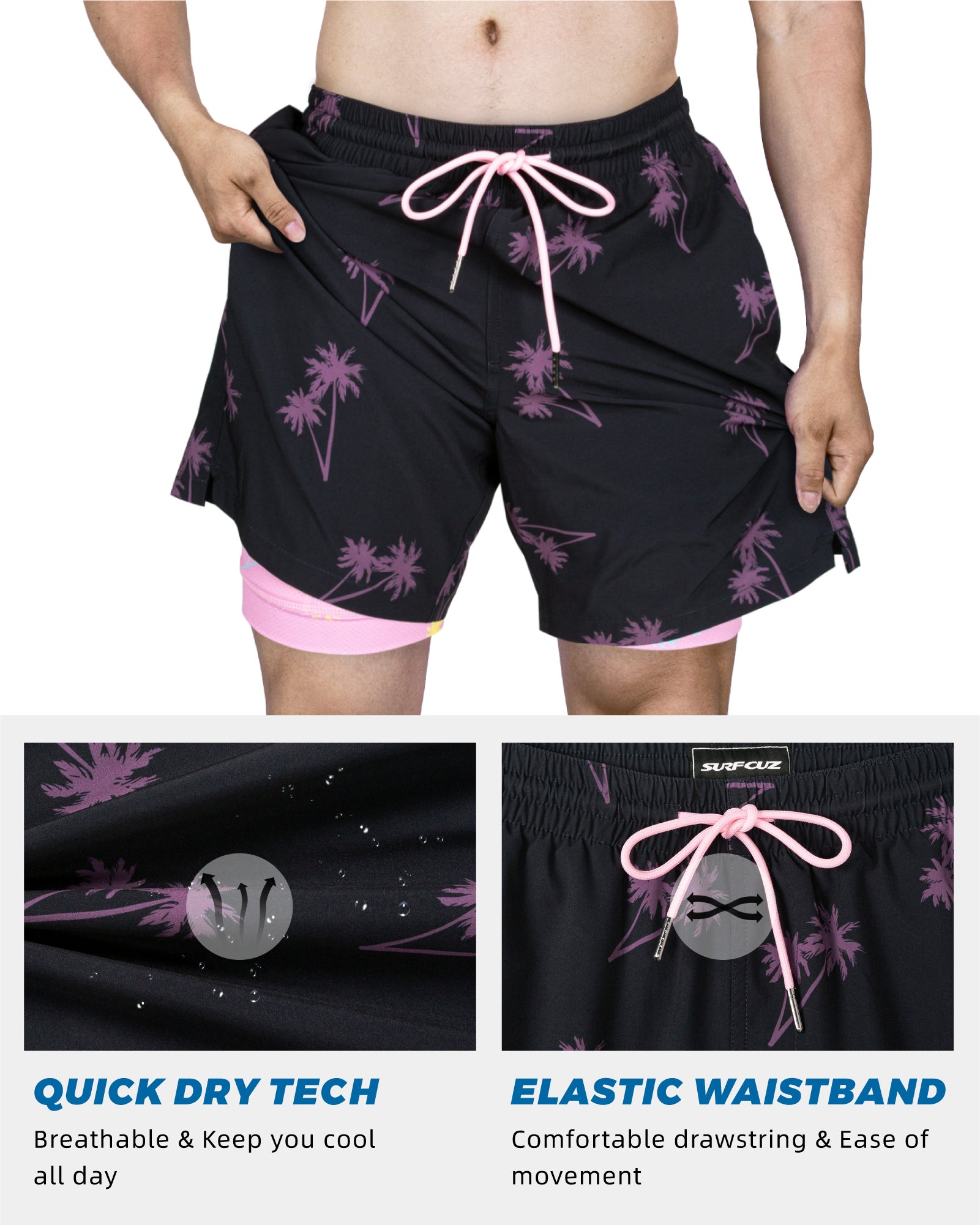 7 ‘’ 4 way Stretch 2 in 1 black coconut tree print swim trunks