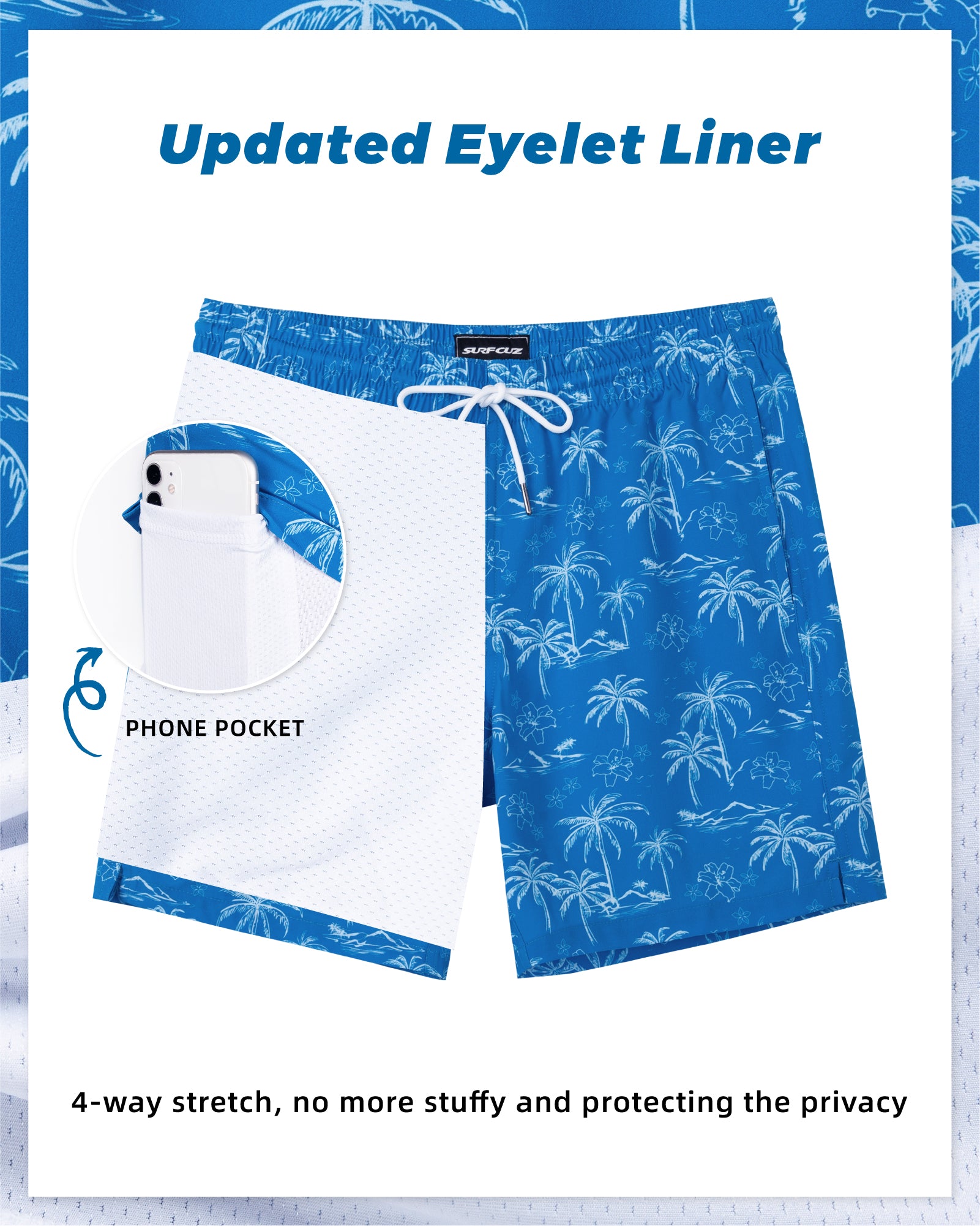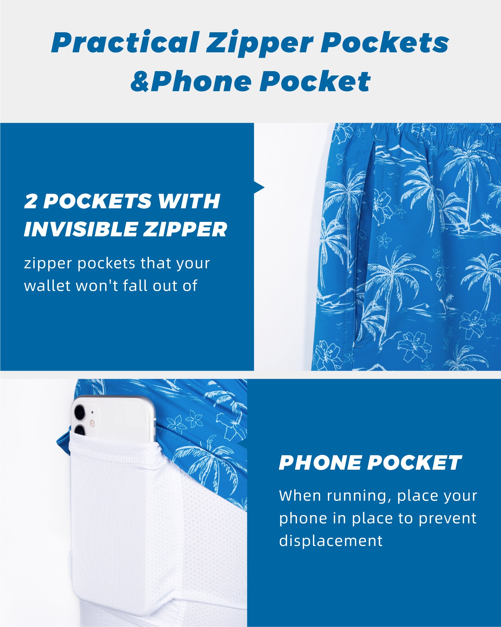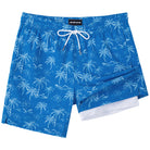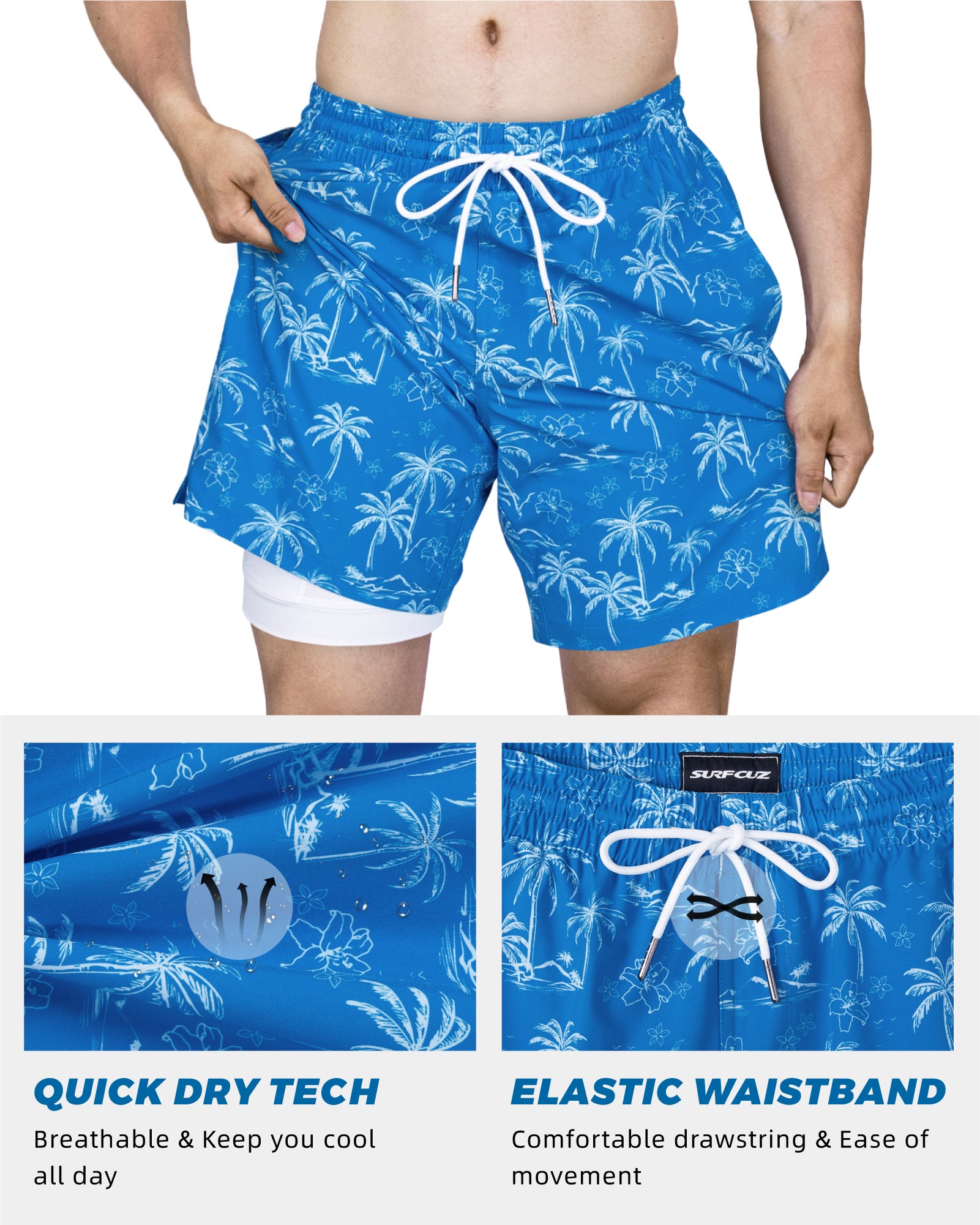 7 ‘’ 4 way Stretch 2 in 1 blue coconut tree print swim trunks
