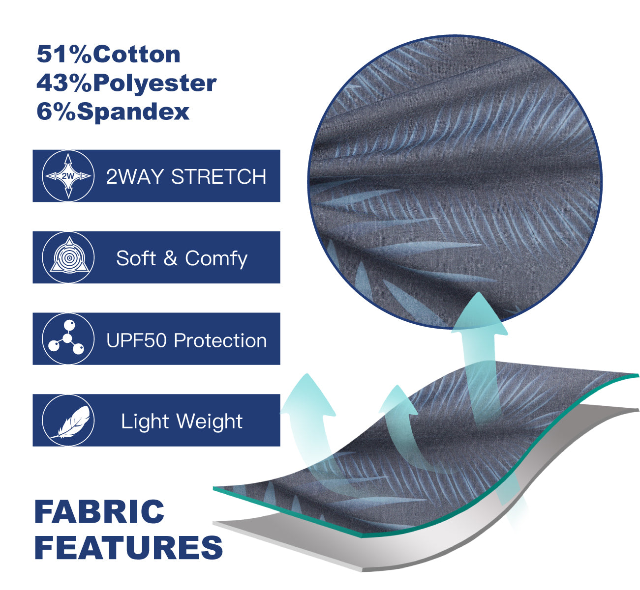 Material: 51%cotton 43%polyester 6%spandex