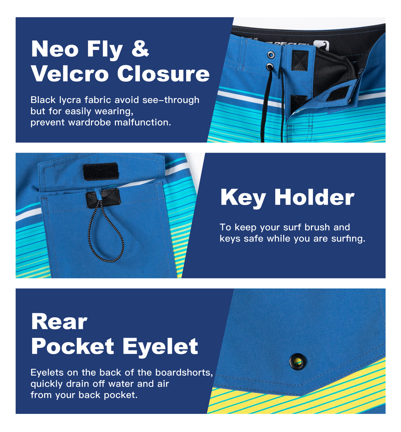 - 【Comfortable Design】Boardshorts for men use hook & loop closure fly with ties to accommodate any movement; No mesh liner offers more freedom.