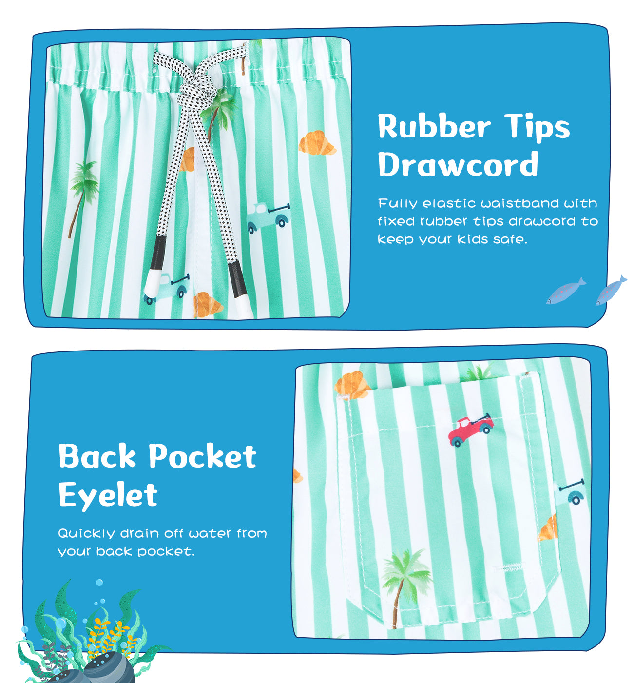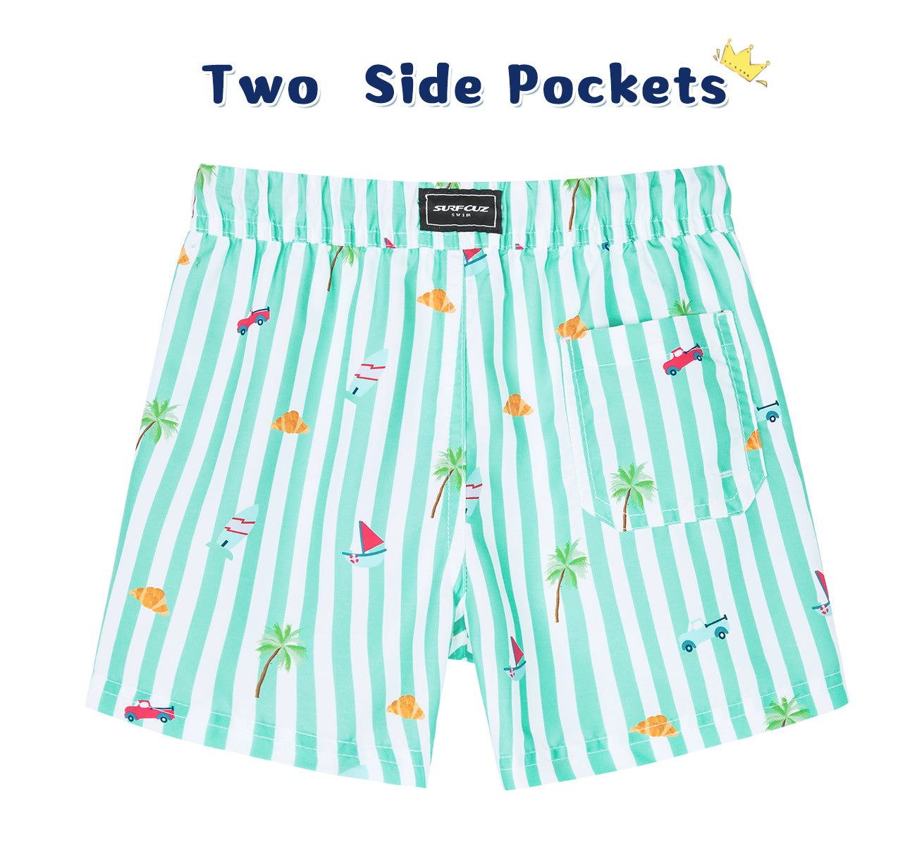 - 🌴Feature: Boys swim shorts are designed with elastic waistband and adjustable drawstring. Two side pockets and one back pocket with nicely embroidered drain hole. And the side seam pockets adopt mesh fabric to facilitate water and sand drain quickly, allowing kids to move freely in the pool, or beach, without restraint.