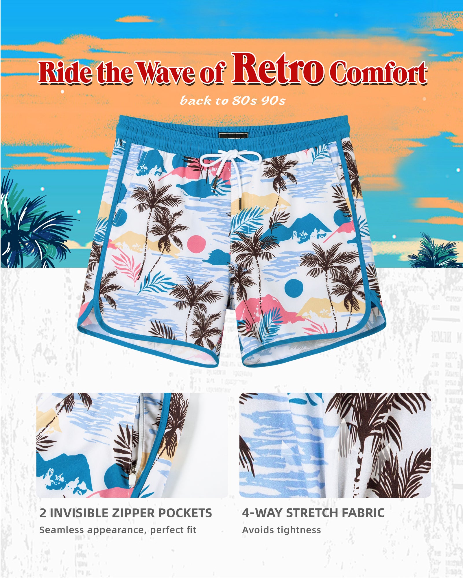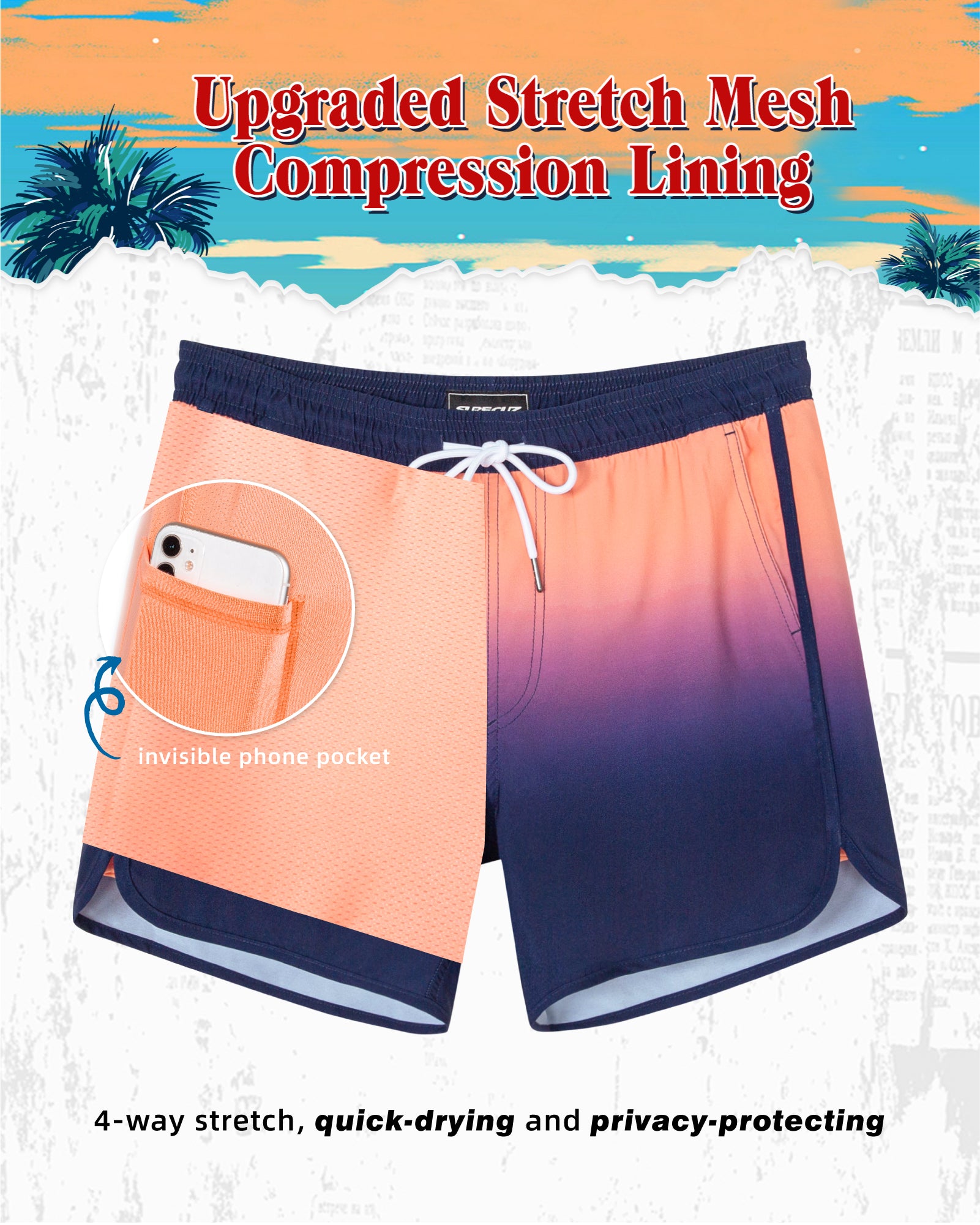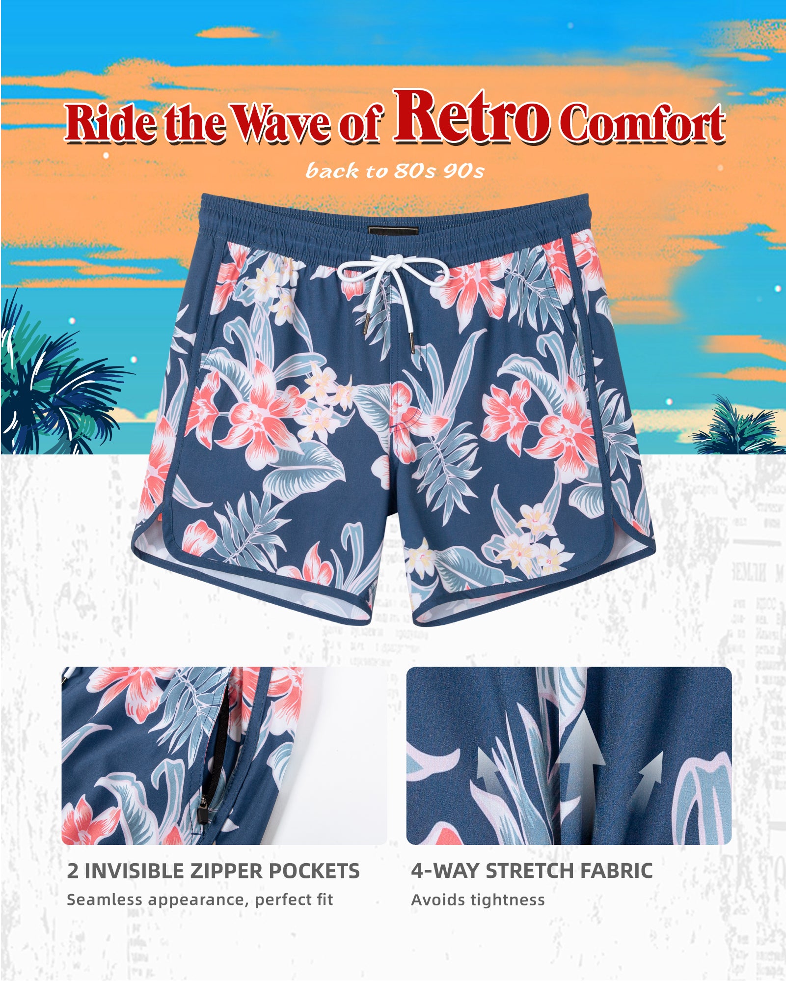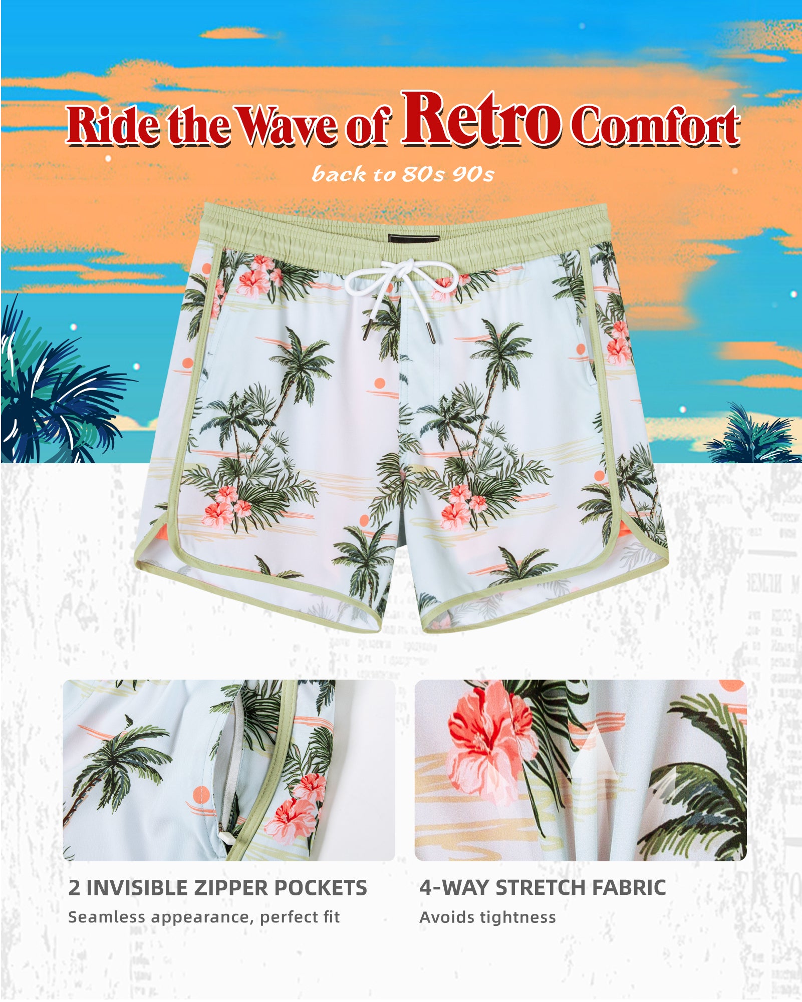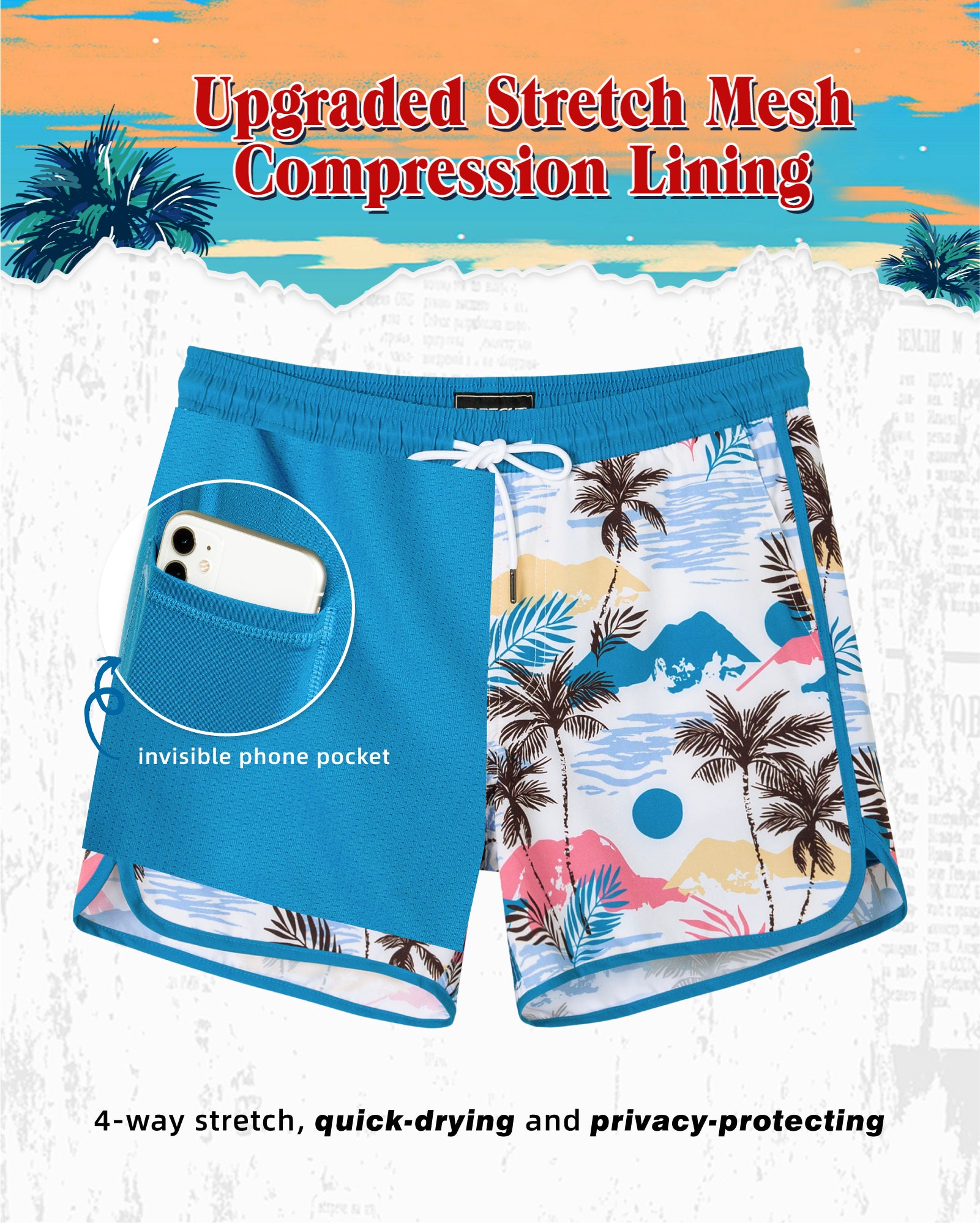 Men‘s Inseam Vintage Swim Trunks With Mesh Lining