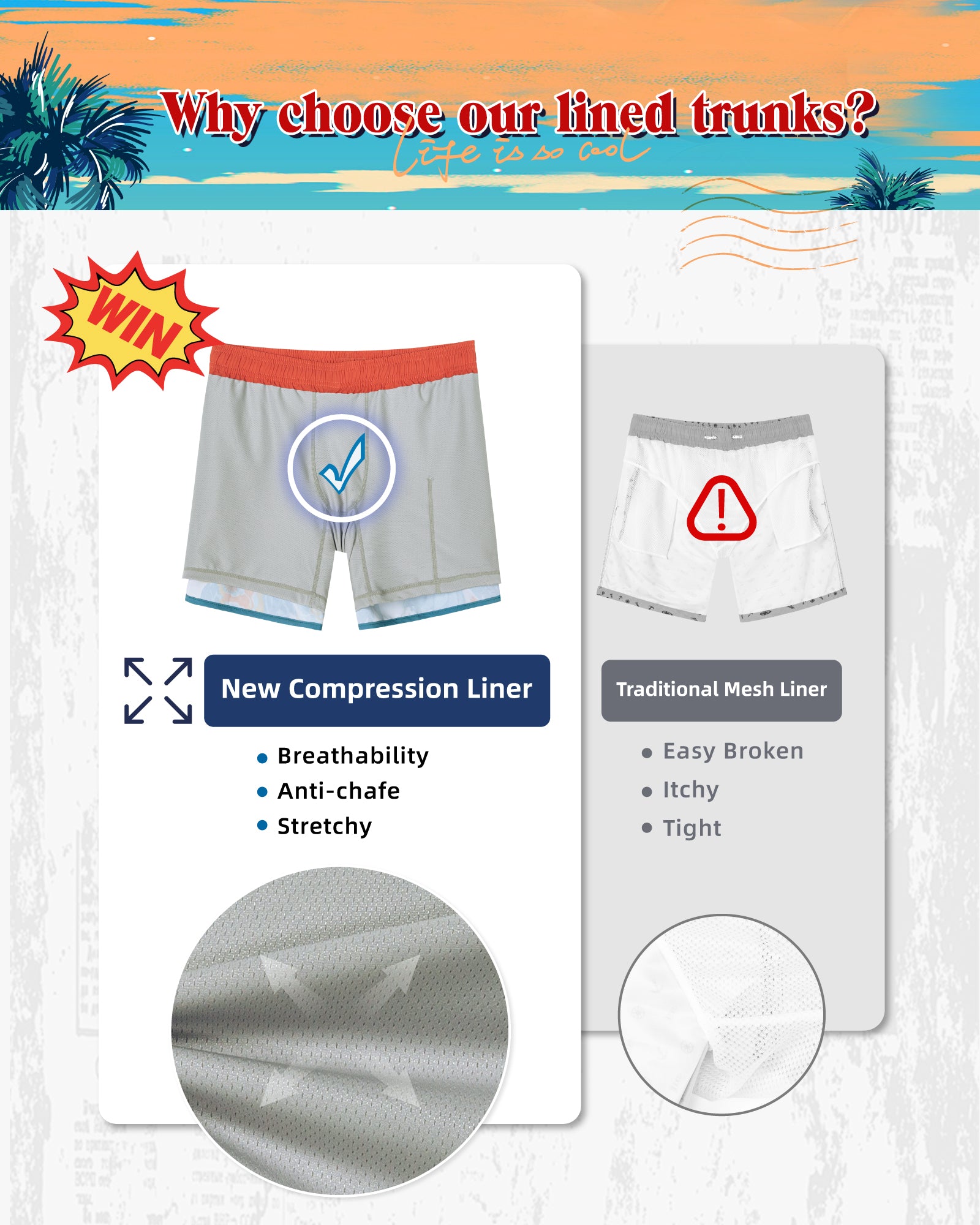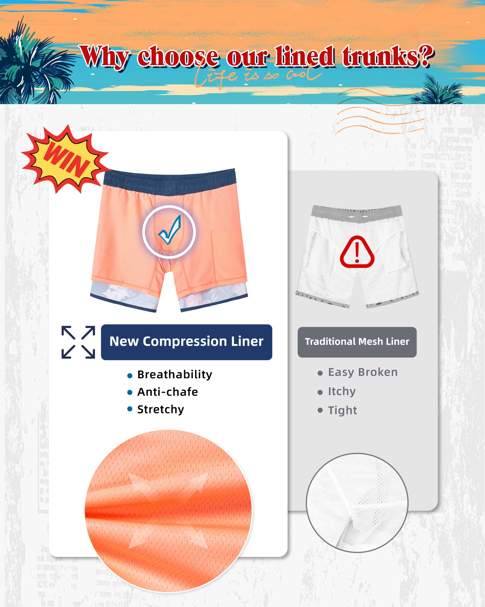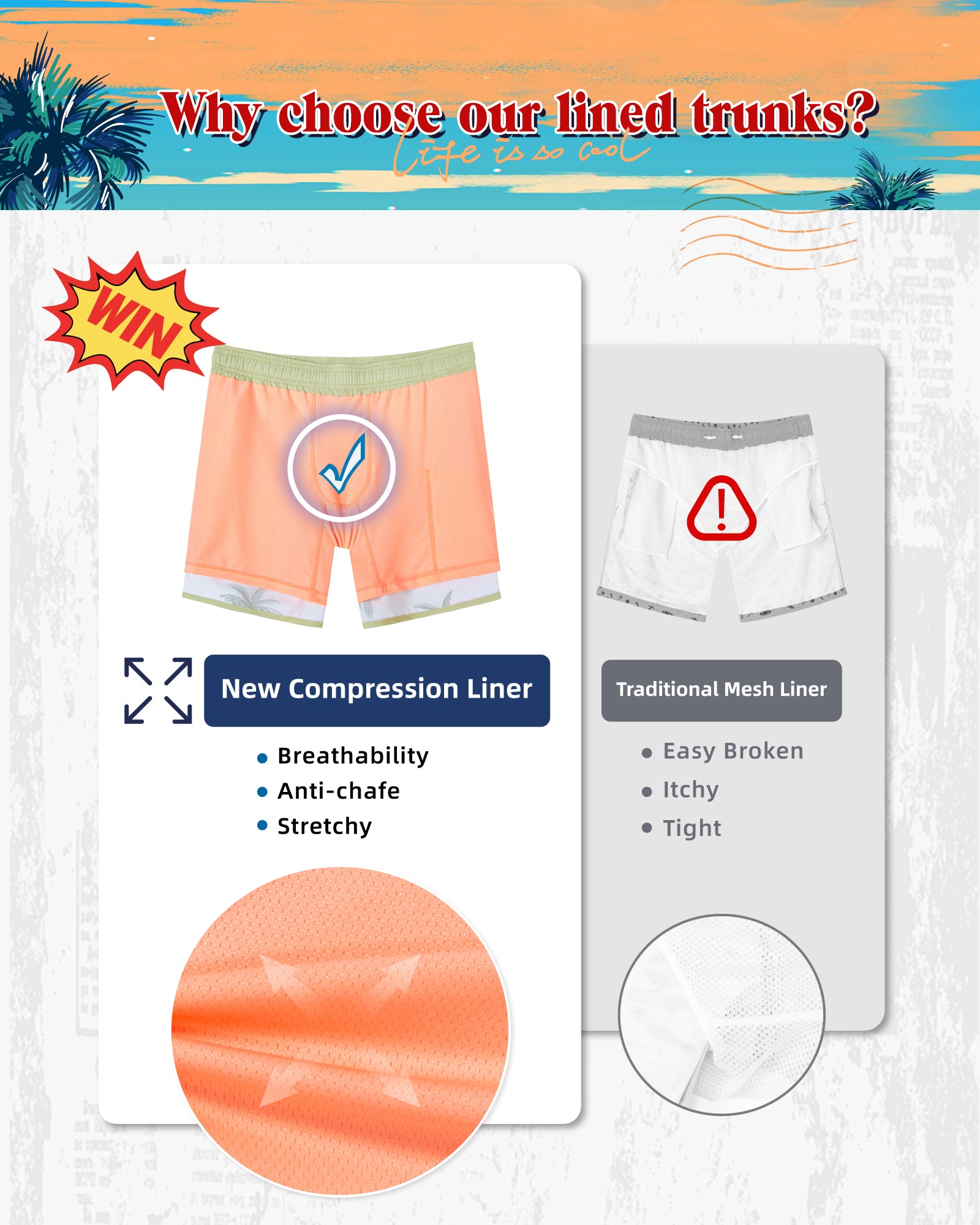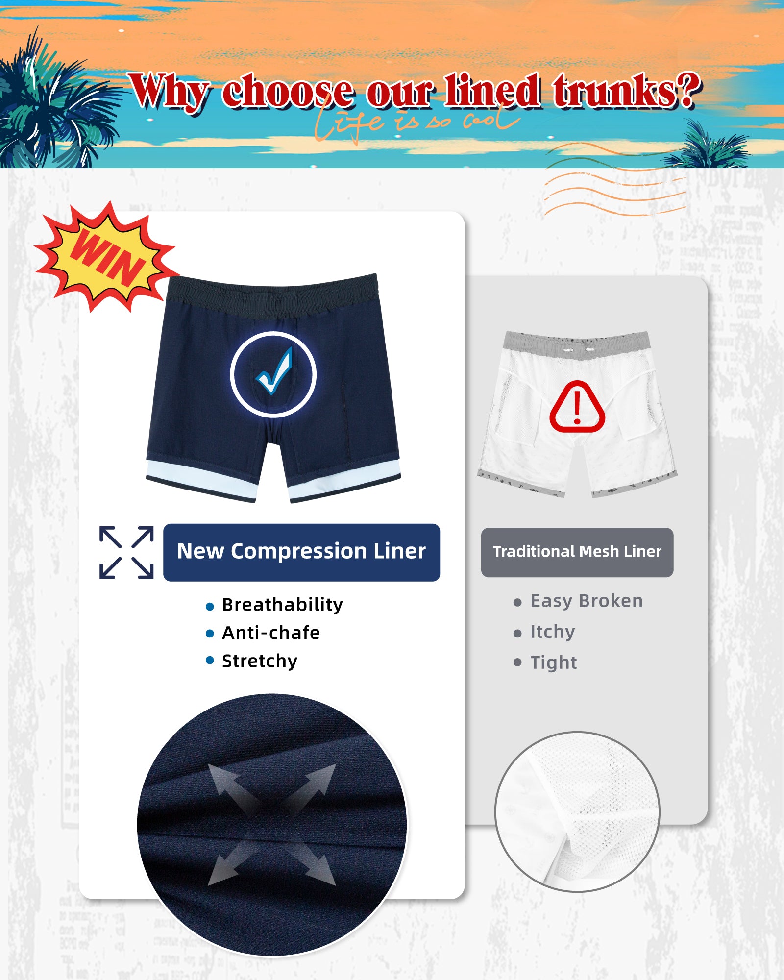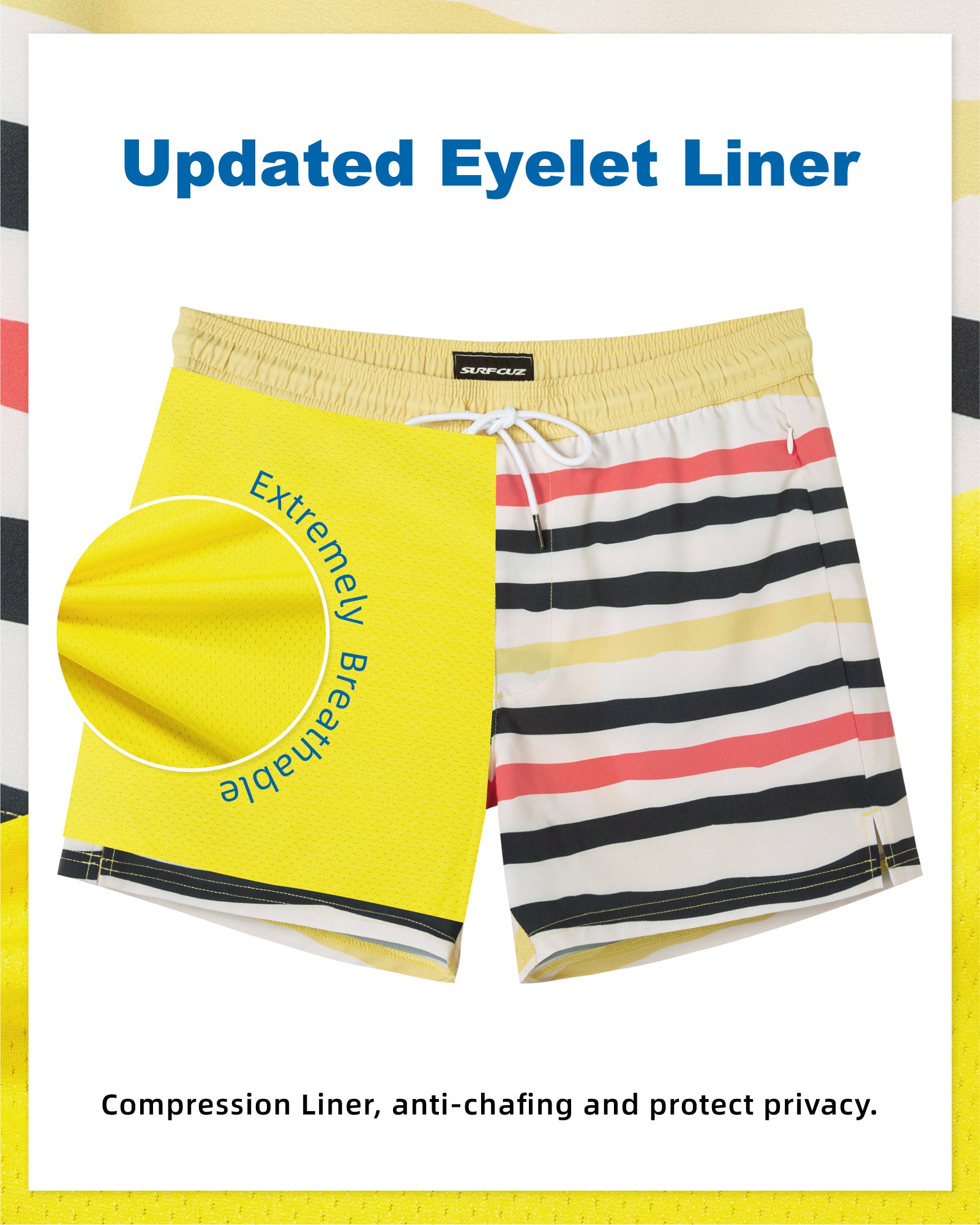 Men‘s Inseam Vintage Swim Trunks With Mesh Lining