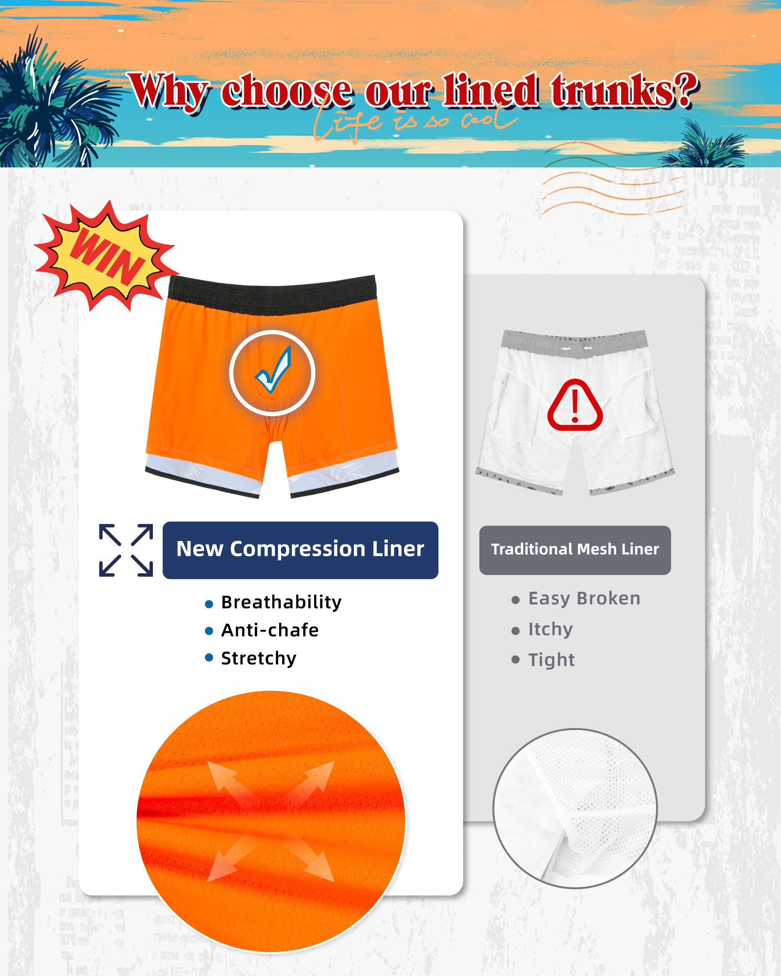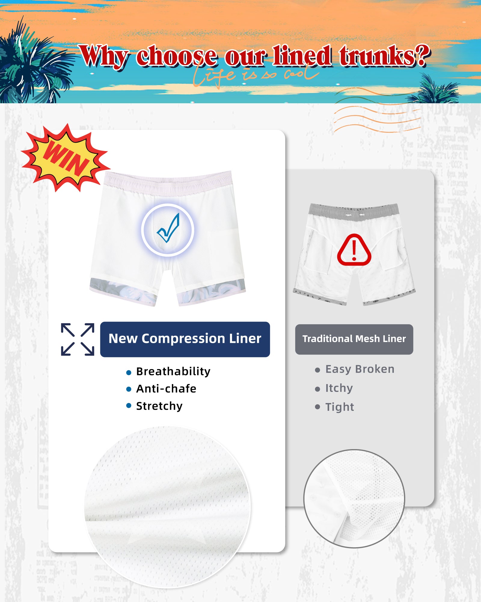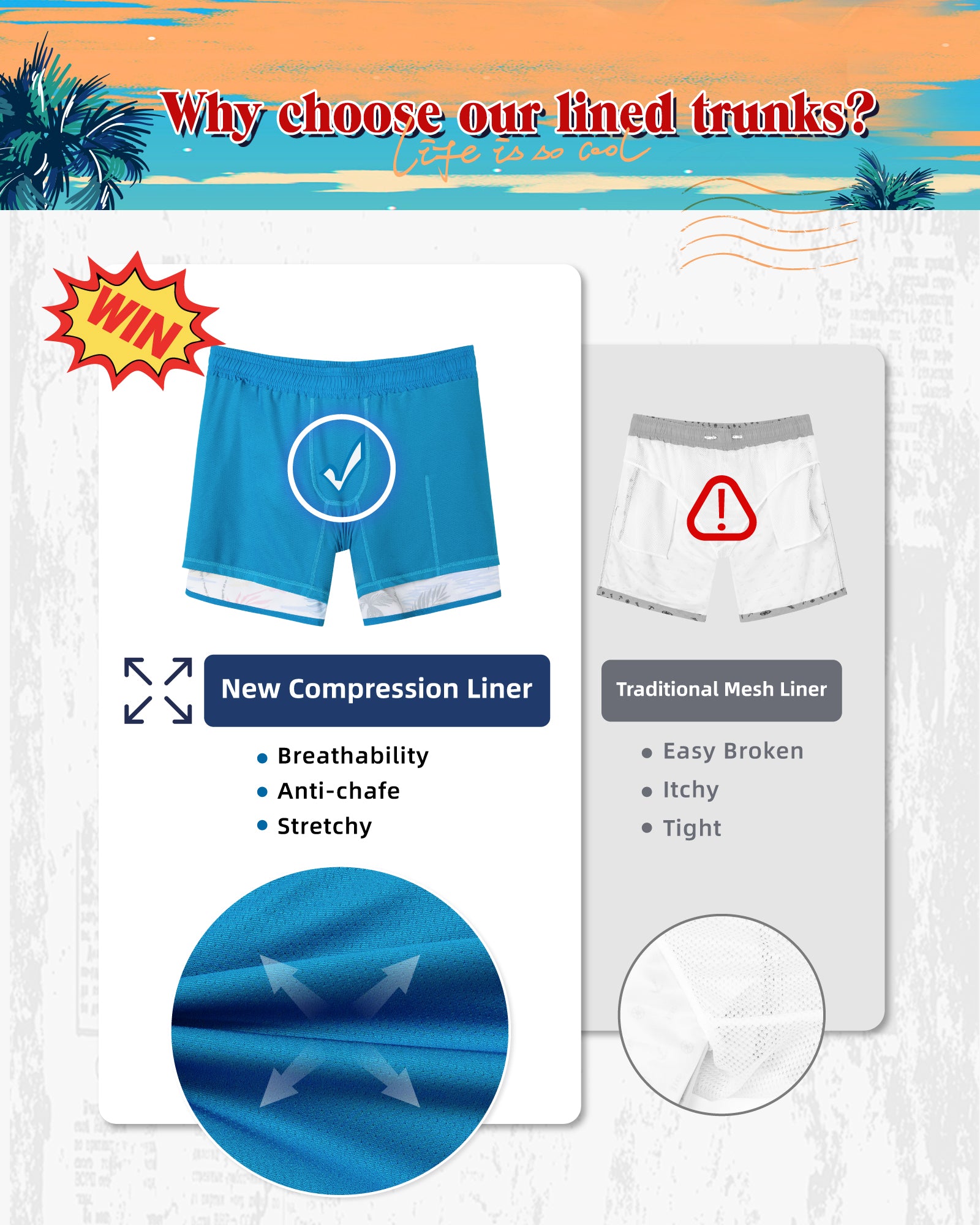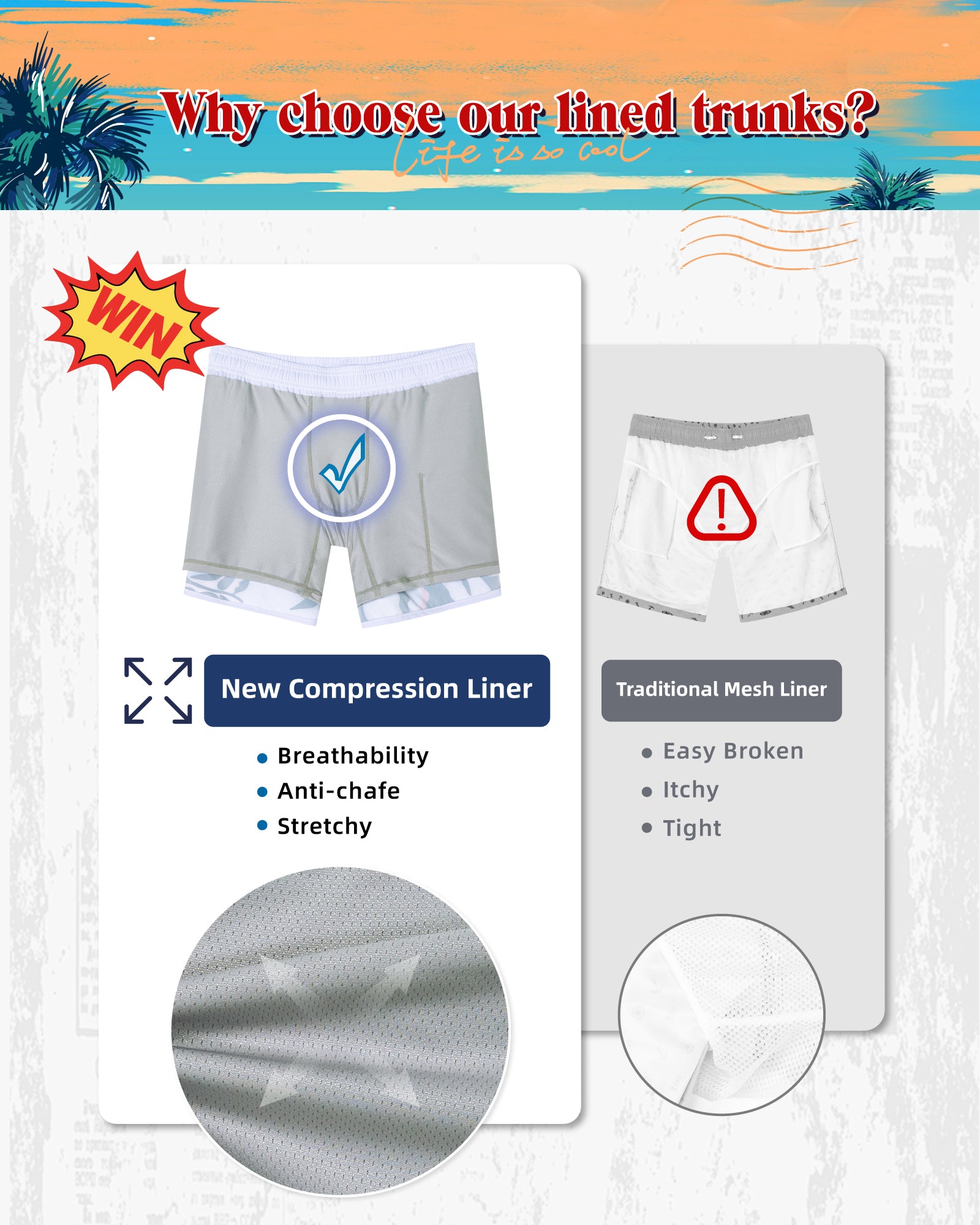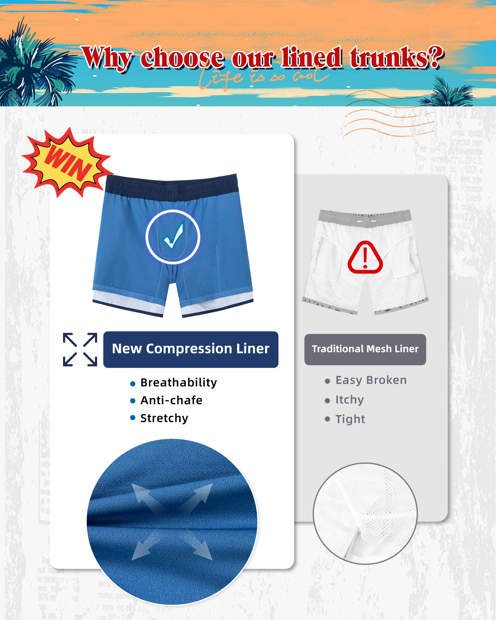Men‘s Inseam Vintage Swim Trunks With Mesh Lining