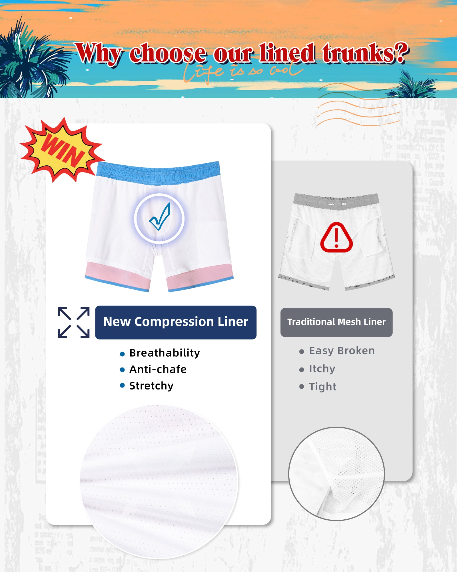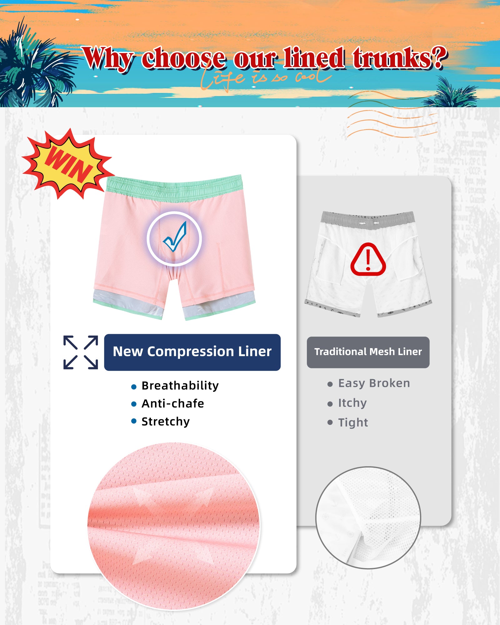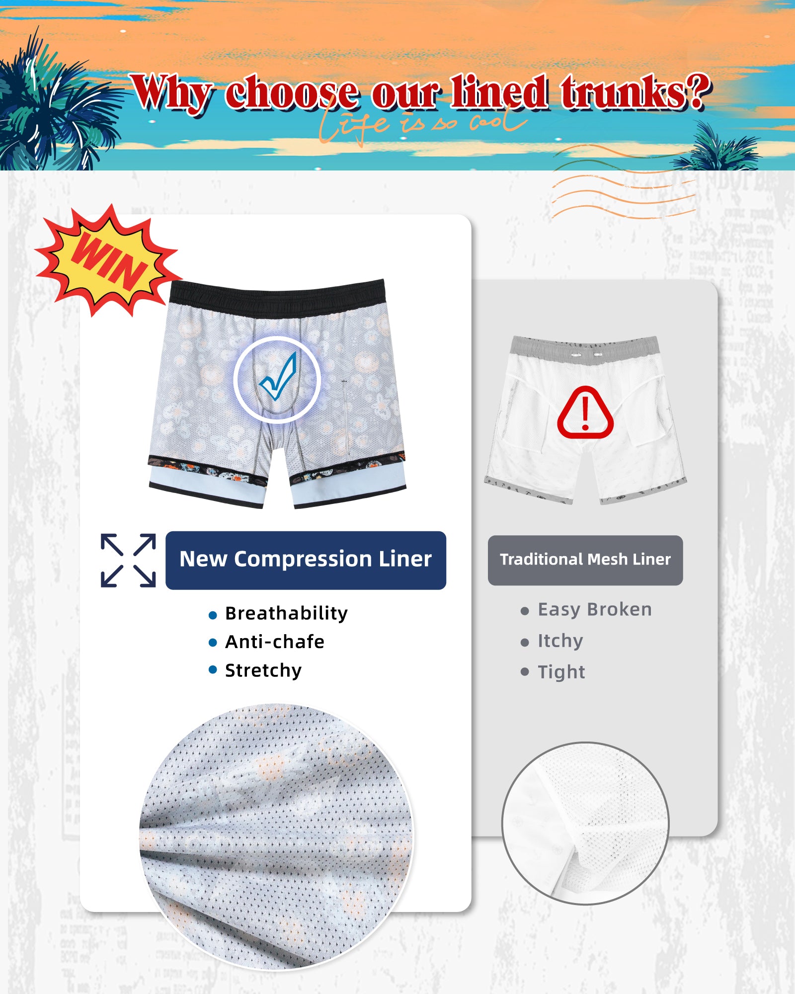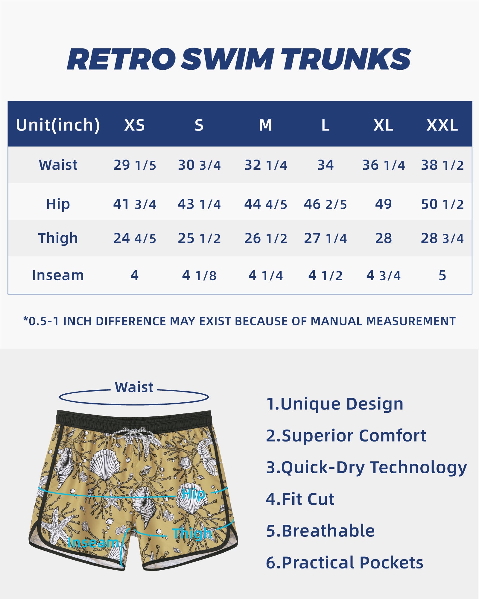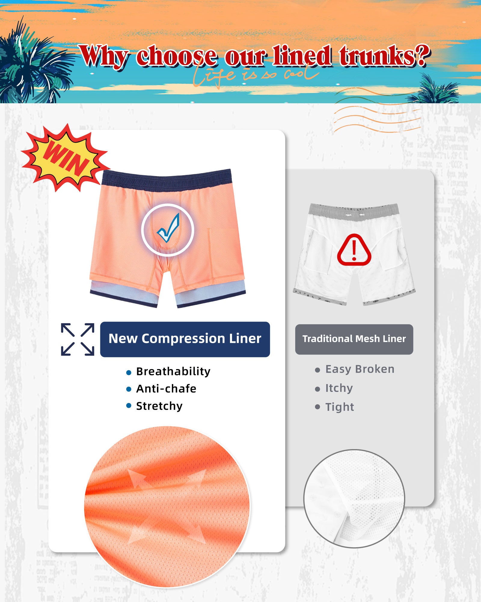 Men‘s Inseam Vintage Swim Trunks With Mesh Lining