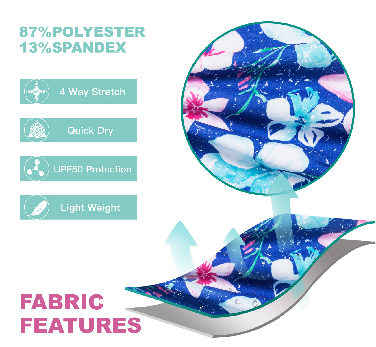 Material: 87 % poliéster, 13 % elastano