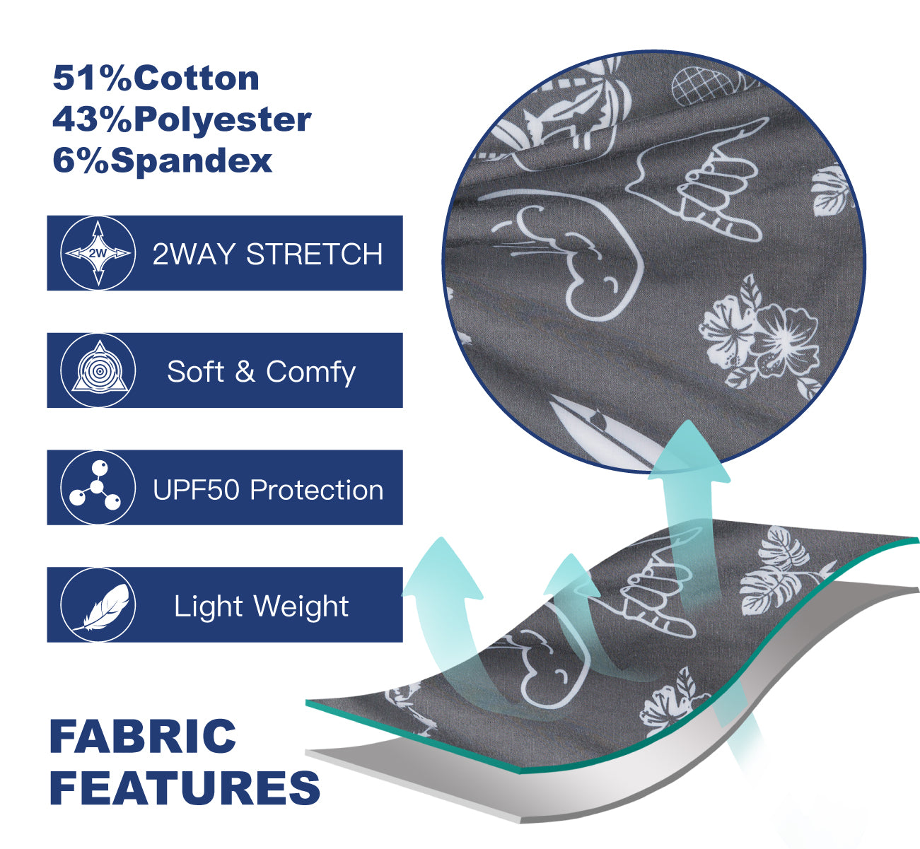 Material: 51 % algodón 43 % poliéster 6 % elastano