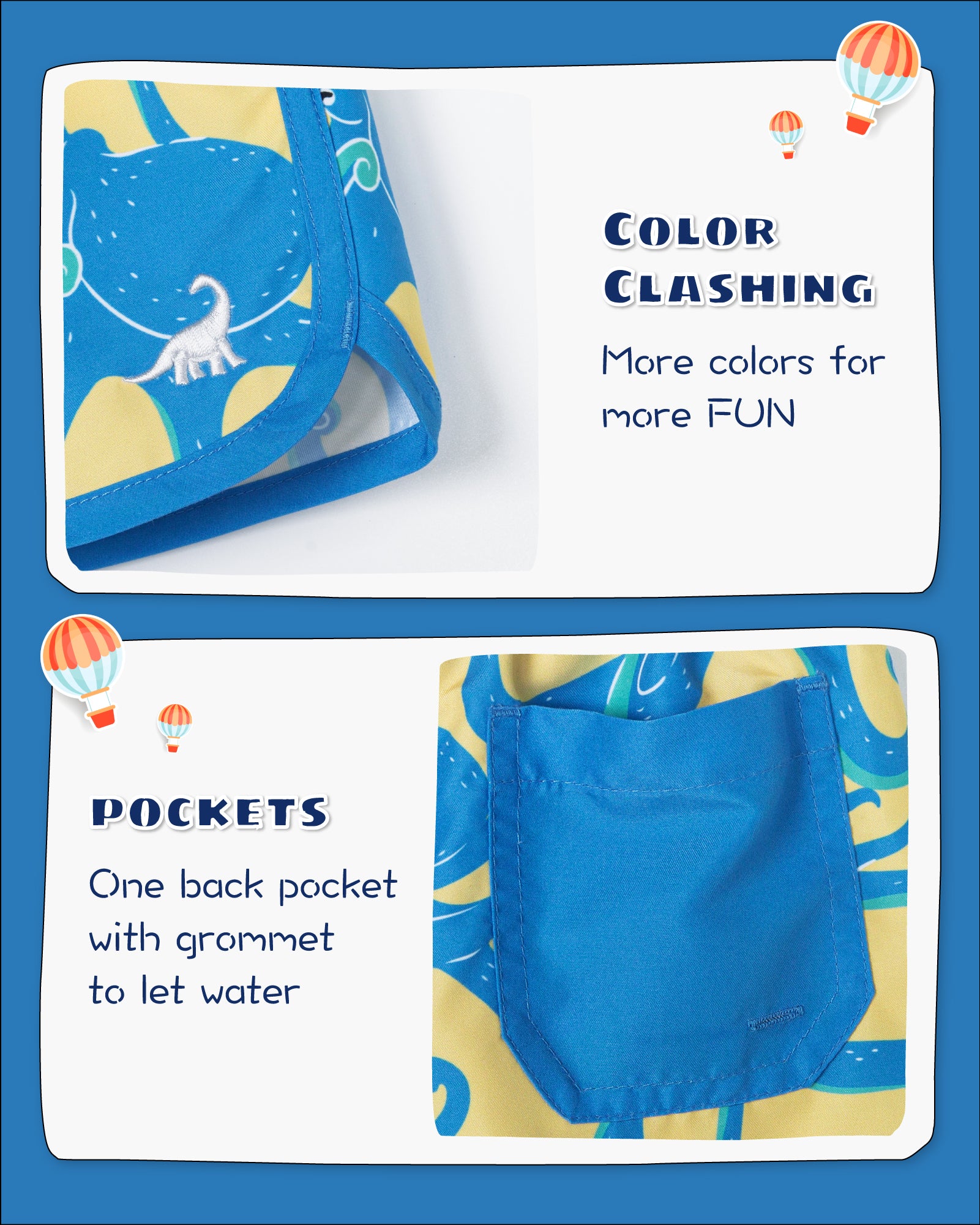 - [Features]: The built-in liner used the comfy 4-way stretch fabric and offers great mobility for kids. Elastic waistband with adjustable drawstring, and one back pocket with embroidery hole, two side seam pockets adopt mesh fabric to facilitate water and sand drain quickly, allows kids to move freely.